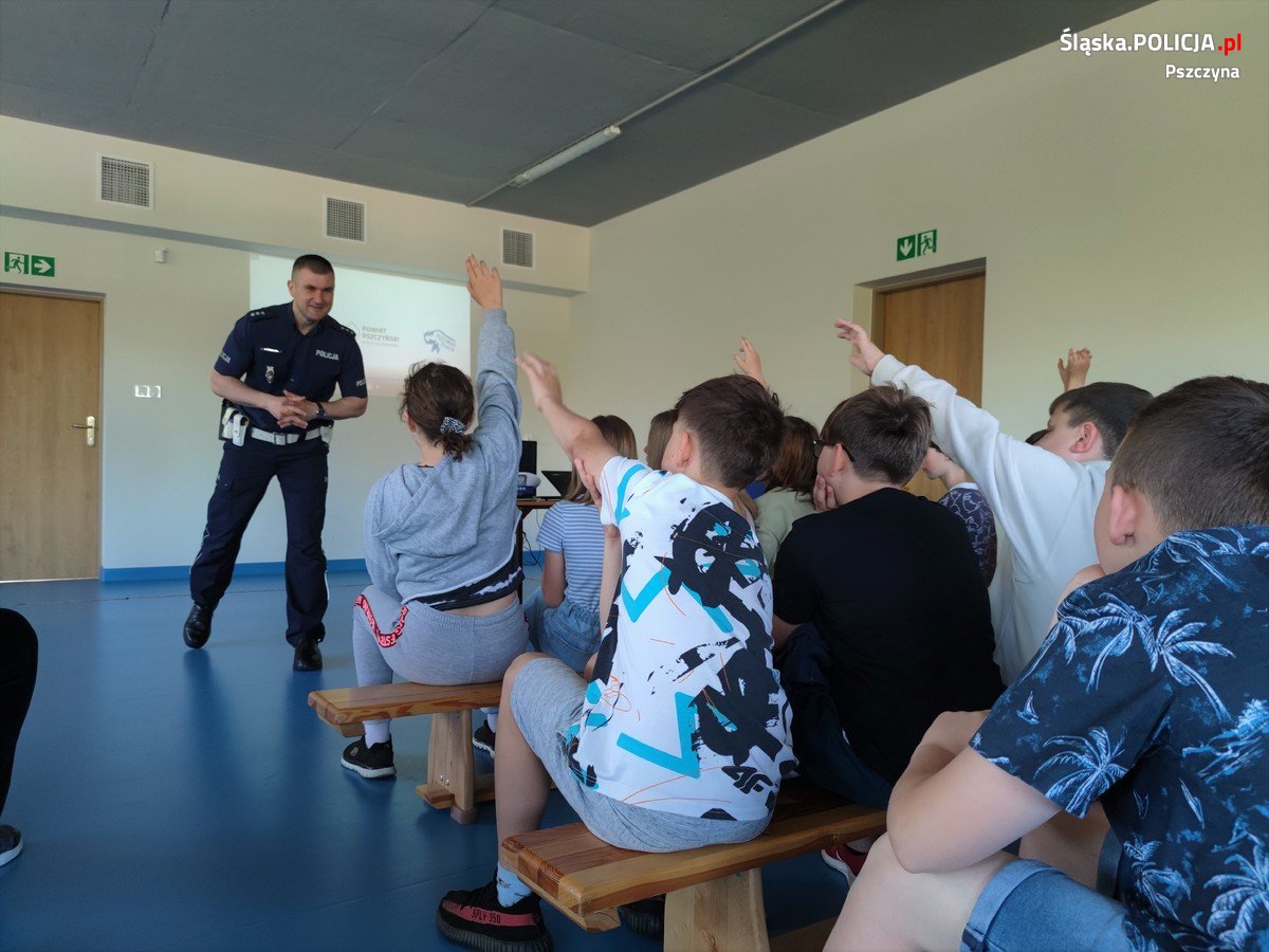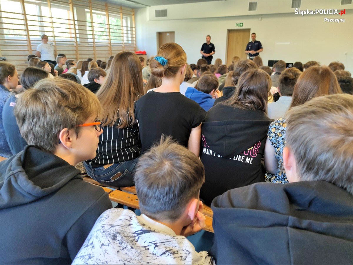 Policjanci z Komendy Powiatowej Policji w Pszczynie realizują cykl spotkań profilaktycznych w szkołach naszego powiatu. Tym razem mundurowi odwiedzili uczniów Szkoły Podstawowej nr 2 im. Jadwigi Śląskiej w Pszczynie. Spotkania stróżów prawa były podzielone na grupy, w których uczestniczyli uczniowie klas od IV do VIII, łącznie około 280 osób. Po krótkim wprowadzeniu policjanci prezentowali filmy profilaktyczne, a następnie szczegółowo je omawiali, odpowiadając przy tym na wszystkie pytania uczniów, a także nauczycieli.