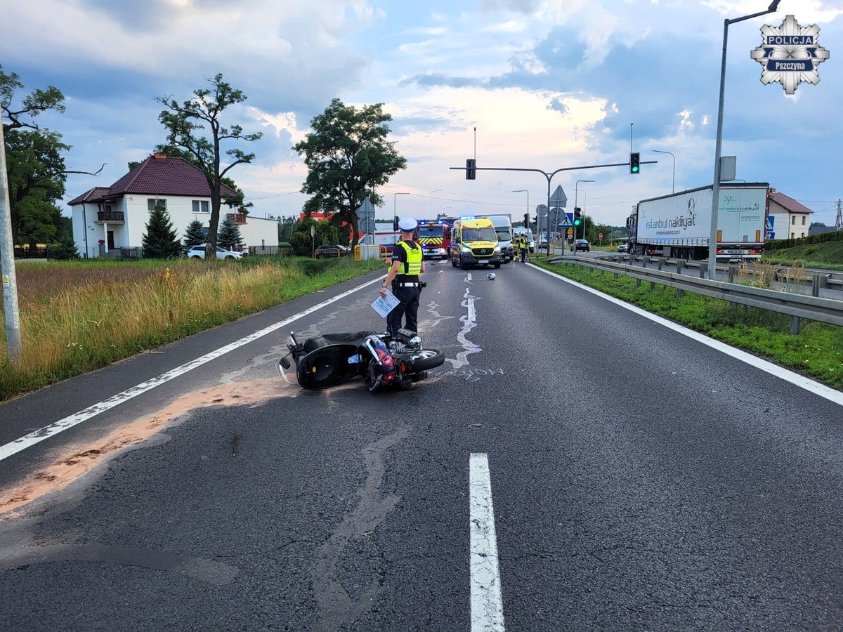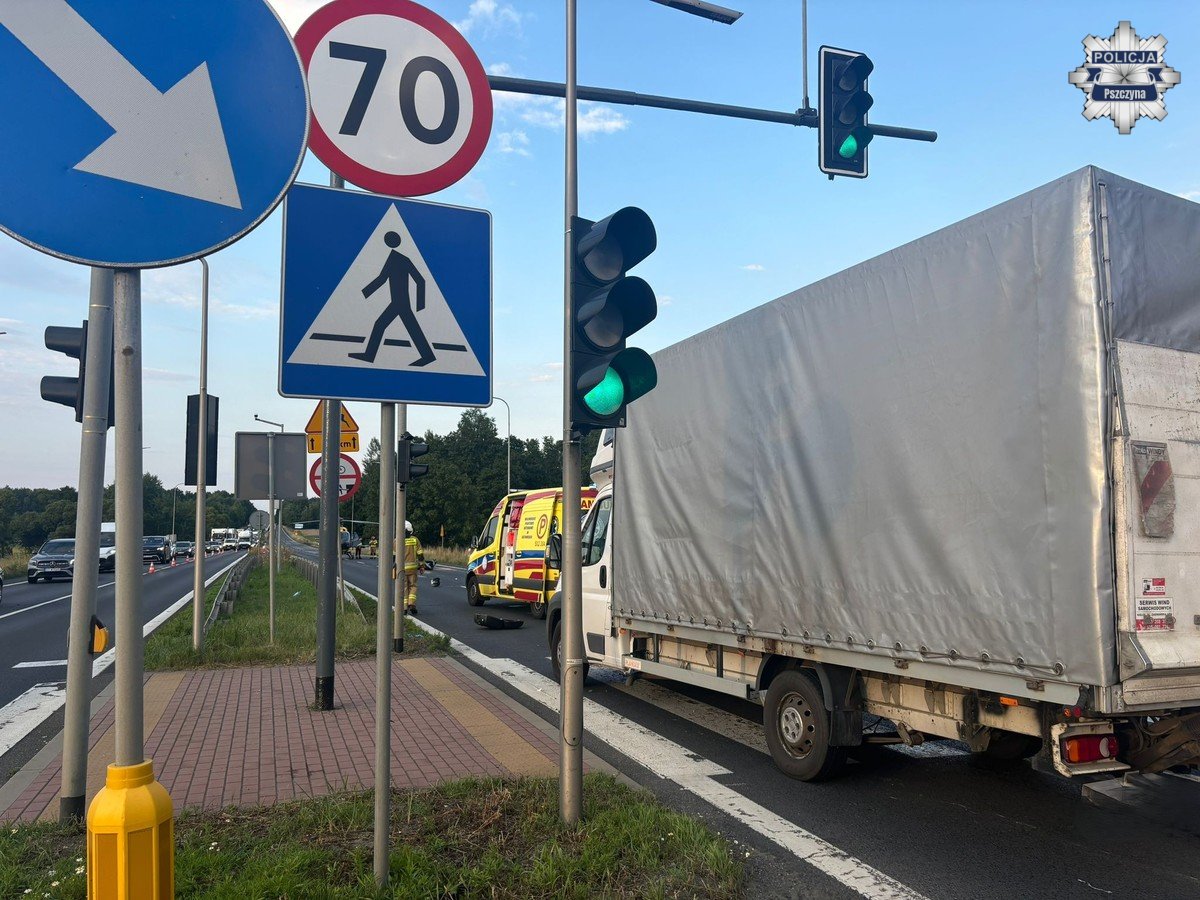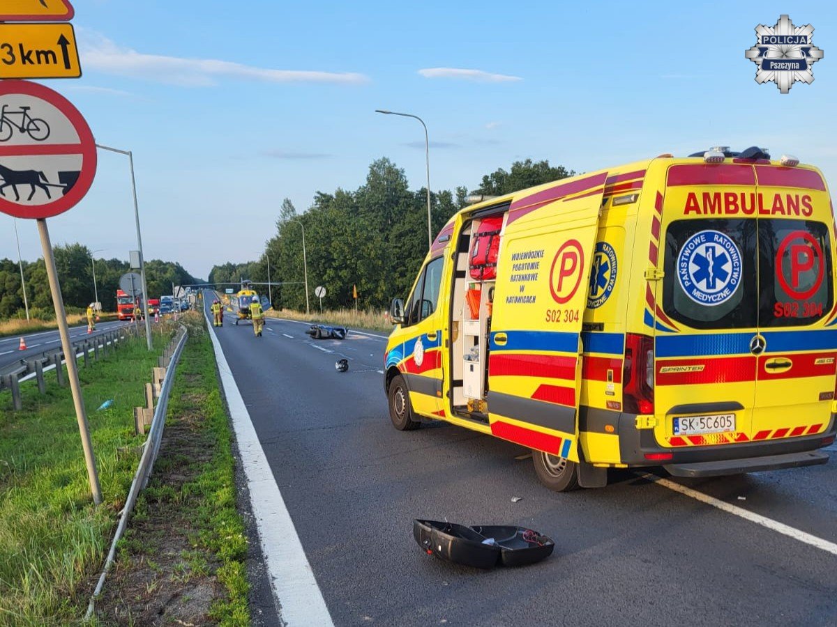 Wczoraj, około godziny 19, na drodze krajowej nr 1 w Kobiórze, na skrzyżowaniu z ulicą Ołtuszewskiego, doszło do wypadku drogowego. Ze wstępnych ustaleń wynika, że 54-letni kierujący motocyklem zatrzymał się przed sygnalizatorem, który nadawał sygnał czerwony. Poruszający się za nim kierujący fiatem ducato, 50-letni mężczyzna najechał na tył motocykla. W wyniku zdarzenia motocyklista z obrażeniami ciała został przetransportowany do szpitala przez Lotnicze Pogotowie Ratunkowe. Do wypadku doszło na prawym pasie jezdni w kierunku Katowic.