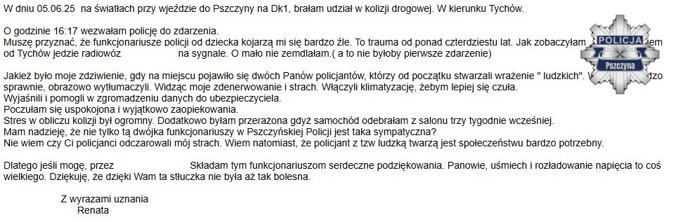 5 czerwca miała miejsce kolizja, po której do pszczyńskiej komendy trafił wyjątkowy e-mail. Pokrzywdzona opisała, że stróże prawa okazali się życzliwi, spokojni i pomocni, co pozwoliło jej przetrwać stresującą sytuację. Takie głosy są dla pszczyńskich policjantów niezwykle budujące i pokazują, że empatia i ludzkie podejście w służbie mają ogromną wartość.